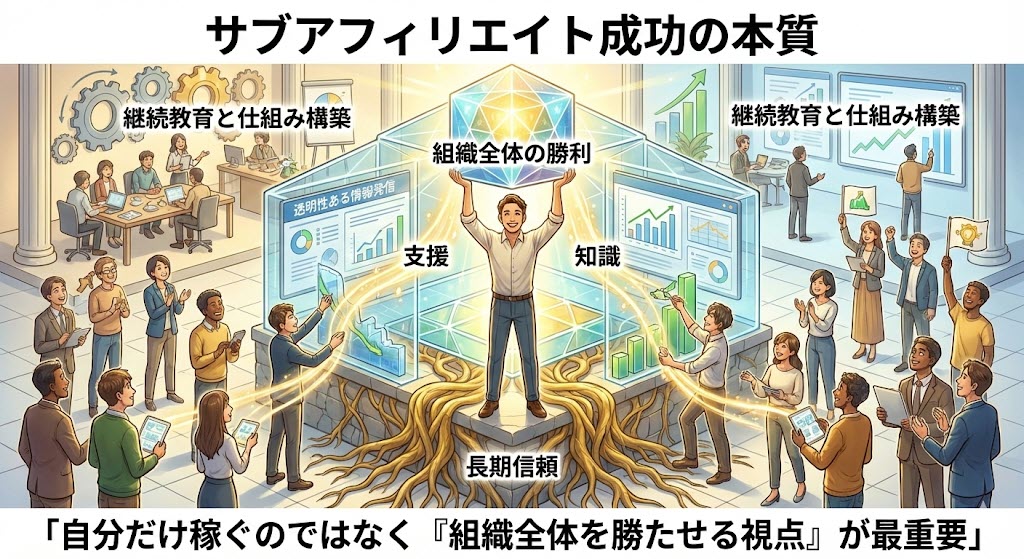 通常のアフィリエイトは「記事を書き続けなければ収益が止まる労働型」になりがちですが、サブアフィリエイトは組織が育つほど自動化される資産型ビジネスになります。